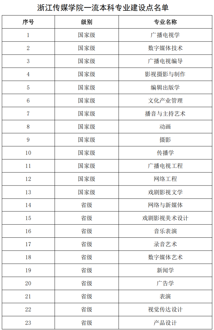 学校涵盖艺术学、文学、工学、管理学、教育学、经济学等6个学科门类,现有艺术学(戏剧与影视)、新闻传播学2个省一流学科(A类),信息与通信工程、公共管理学2个省一流学科(B类);拥有新闻传播学、艺术学2个一级学科学术硕士学位授权点,以及国际中文教育、翻译、新闻与传播、出版、电子信息、图书情报、音乐、舞蹈、戏剧与影视、戏曲与曲艺、美术与书法、设计等12个专业硕士学位授权点,涵盖了传媒、艺术、文学、教育、技术、管理等领域;设有38个本科招生专业,其中广播电视学、编辑出版学、传播学、影视摄影与制作、广播电视编导、动画、播音与主持艺术、戏剧影视文学、摄影、数字媒体技术、网络工程、广播电视工程、文化产业管理等13个专业为国家级一流专业建设点,另有省级一流专业建设点10个,有着专业领先的先发优势。